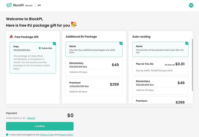 After claiming the Free Package Gift, there will be a subscription on the overview subpage of the Billing page. The Free package is a gift package to be distributed to registered users on the 1st of every month. The number of RUs for early bird registration is 100,000,000. Thank you for using our service!